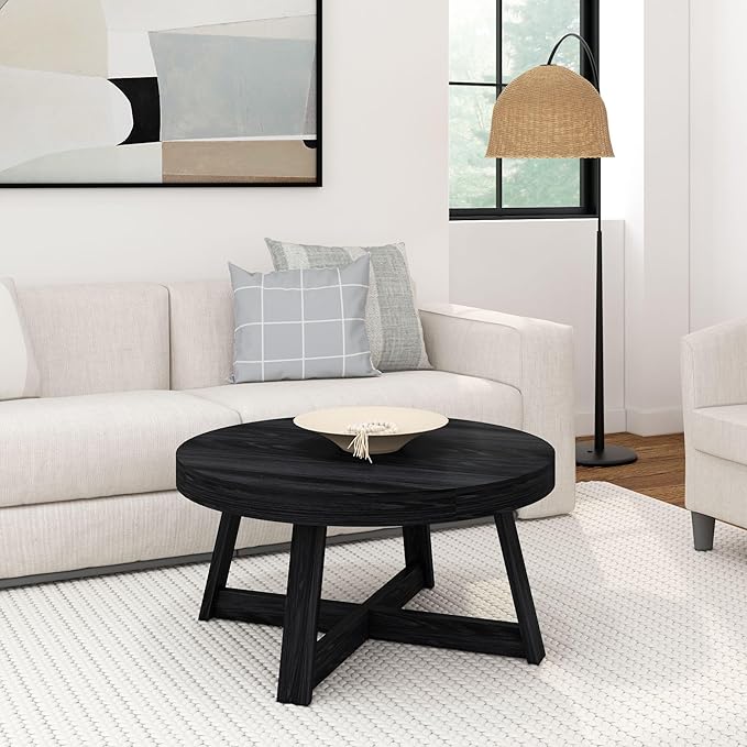 Finished in a black wirebrush stain, the table showcases the natural wood grain with added texture and rustic character. The round silhouette encourages easy movement and conversation, especially in smaller or more intimate living spaces. Whether you’re placing coffee table books, drinks, or décor, its smooth, spacious surface offers both practicality and visual appeal.
