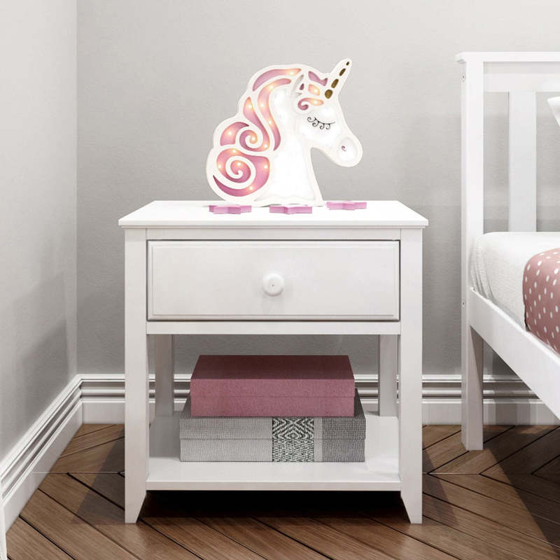 Ideal for storing bedtime essentials, the nightstand features a smooth-gliding drawer to tuck away small items like flashlights or journals, and a lower open shelf that’s perfect for books, baskets, or toys. The rounded edges and non-toxic finish make it safe for younger children, while its clean-lined silhouette and bright white finish complement both modern and traditional room décor.